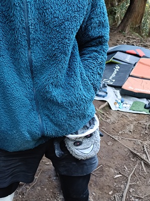 チョークバッグを左太腿前部に装着して、その中にカイロを入れてレスト時に指先の暖をとる作戦。